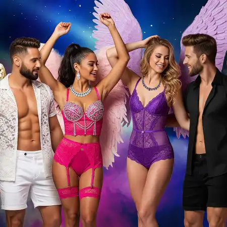 women: lingerie | men: pants | both: accessories (halos, wings, etc.) -