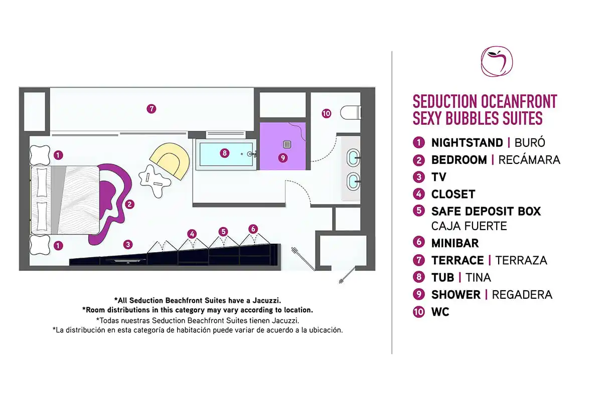 Incluyen obsequios, servicios y amenidades adicionales exclusivos de nuestra categoría Sexy Bubbles. Cada suite cuenta con un jacuzzi para dos personas en la habitación, una sala de estar con televisión LED de 48 pulgadas, cafetera Nespresso, y un baño completo con inodoro separado, dos lavabos y regadera tipo lluvia.