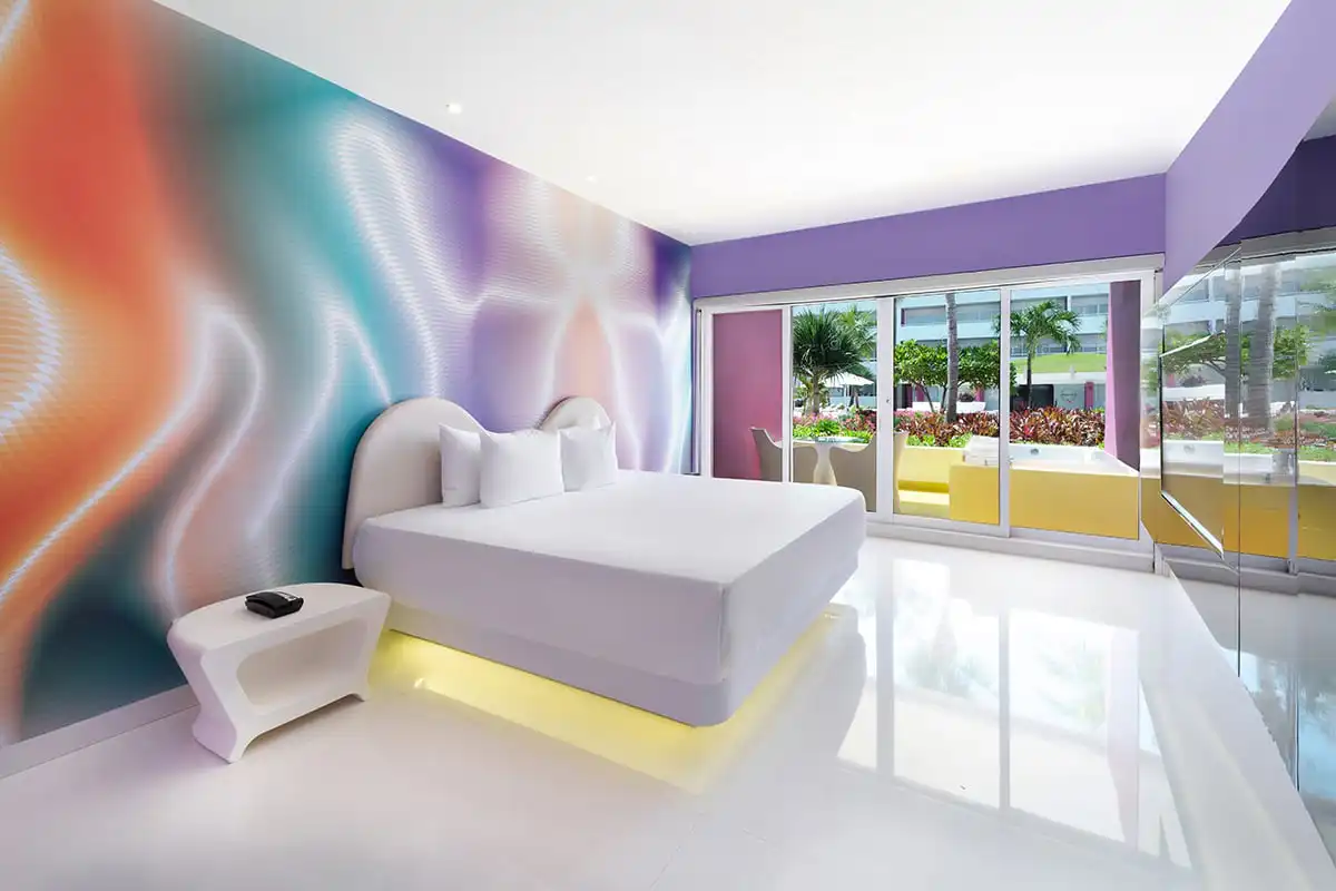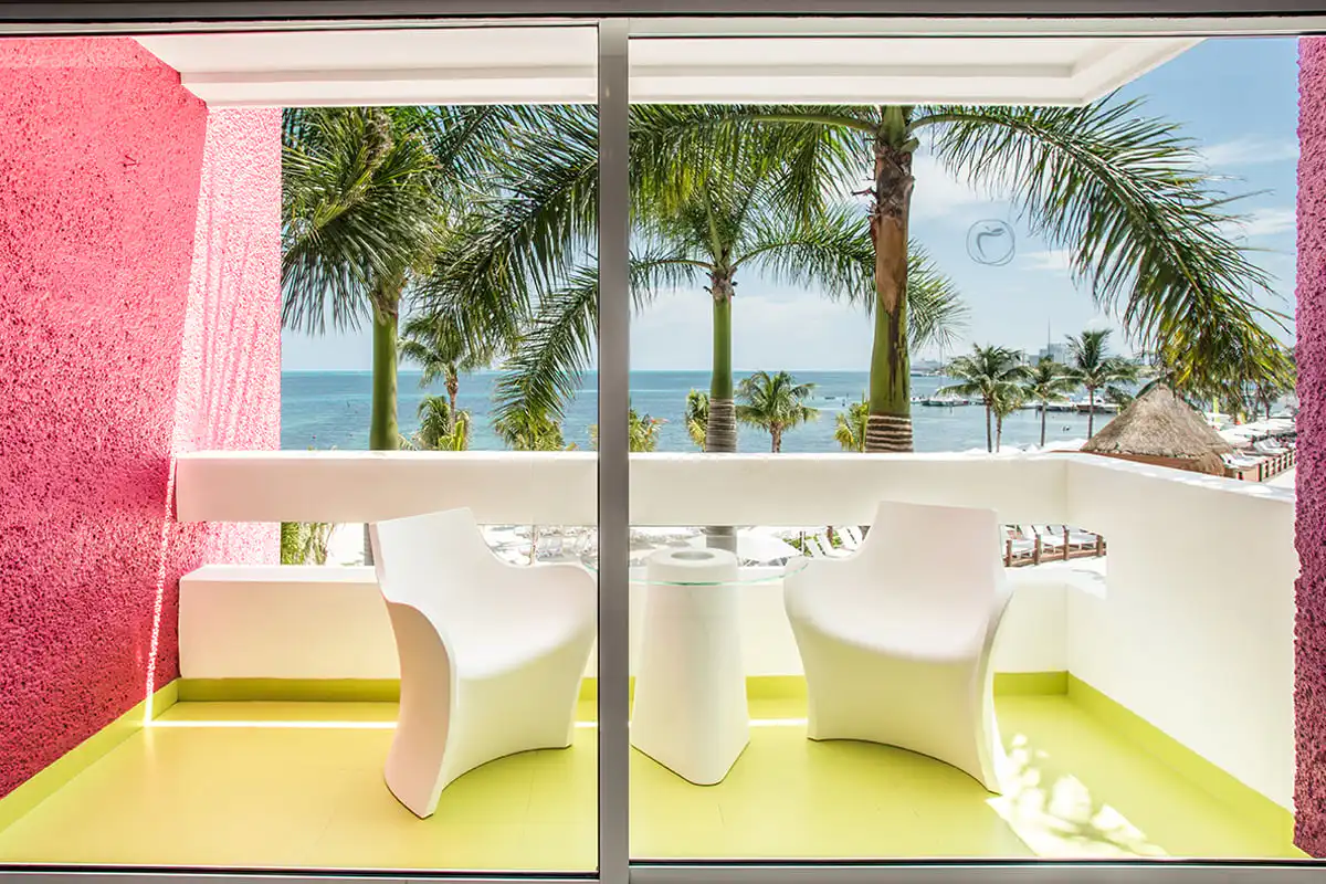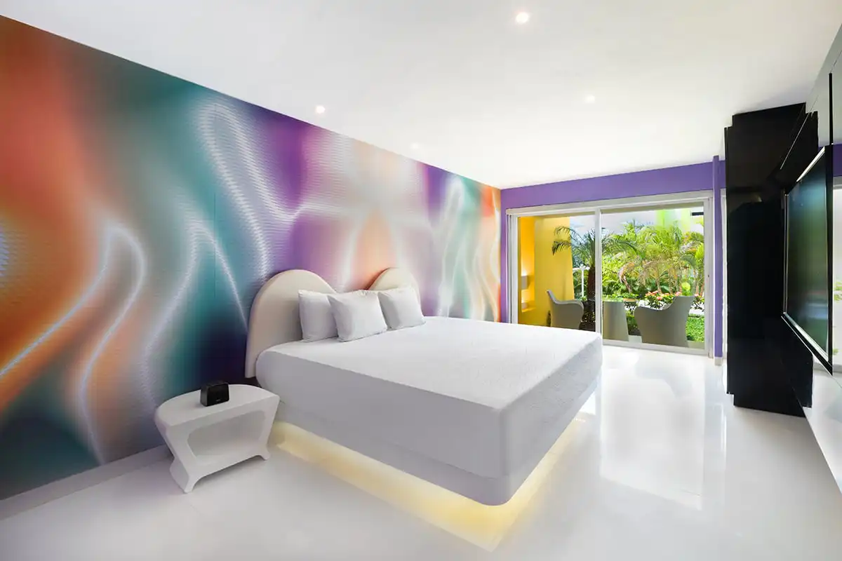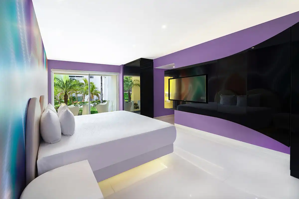 These rooms overlooking the Sexy Pool have a spacious balcony, living area with LED TV, Nespresso coffeemaker, and a bathroom with separate toilet, two sinks, and a spectacular rain shower. Pool and beach concierge service available for this category.