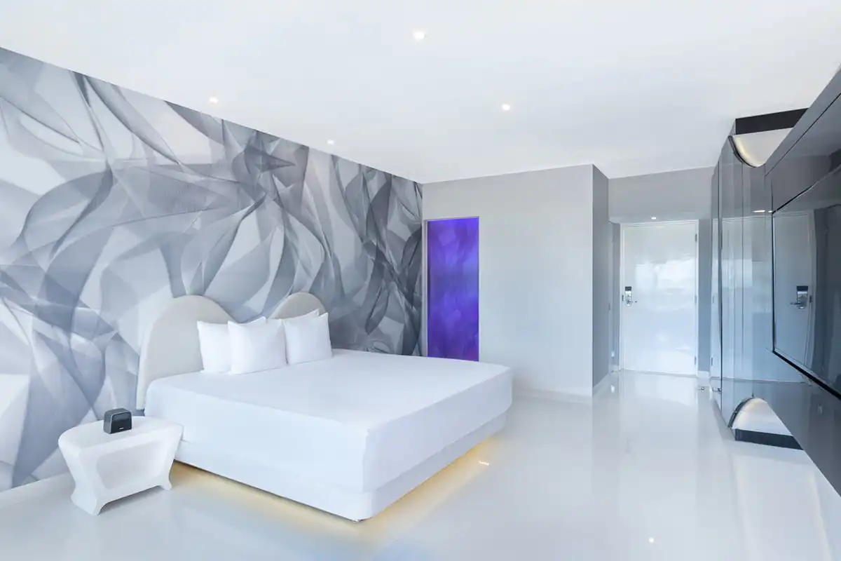 One-bedroom penthouses with 65″ LED TVs, living room, Nespresso coffeemaker, stocked bar, ice machine, stripper pole, balcony with jacuzzi, sitting area, loungers, butler service, pool and beach concierge, and two bathrooms with one with tub and the other with a rain shower.
