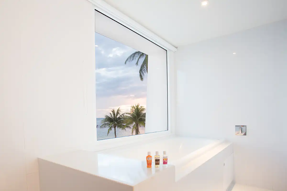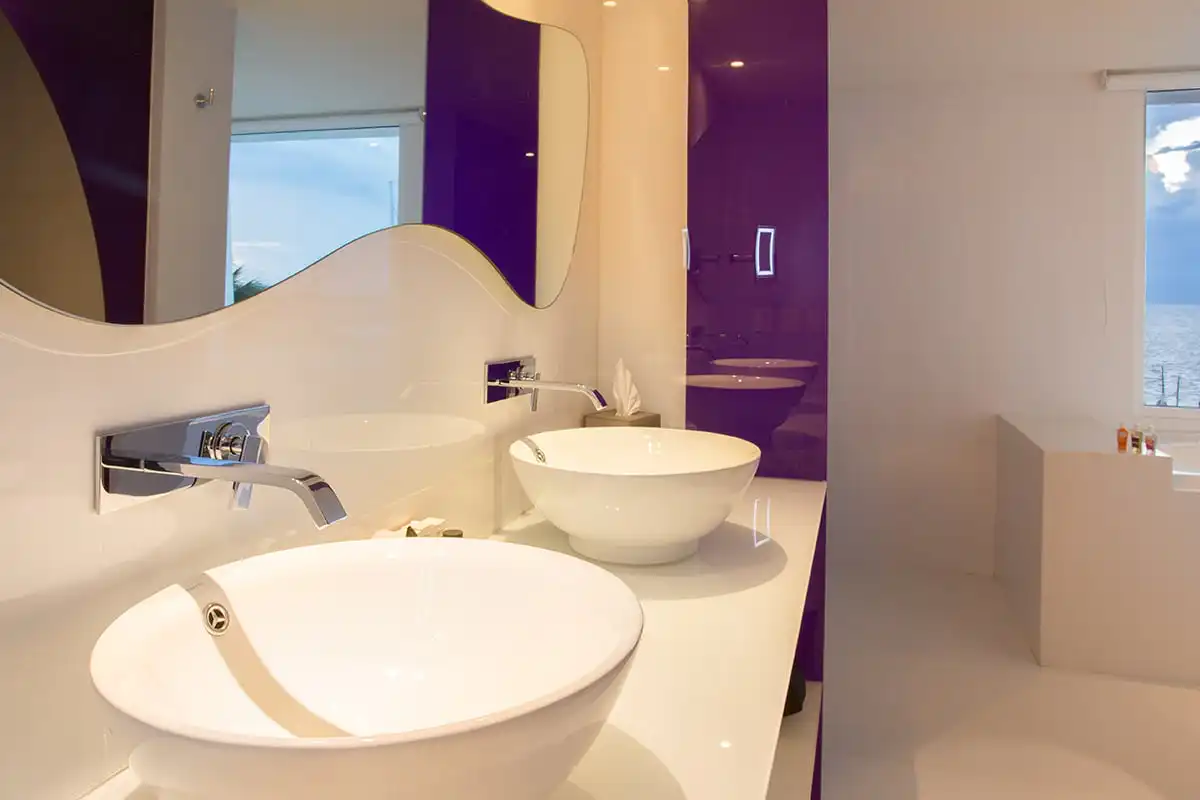 Offers a spacious balcony with stunning views of the Sexy Pool and the Caribbean Sea. They feature a spacious living room with a 48″ LED TV, concierge service on the beach and by the pool, and a full bathroom with a separate toilet, two sinks, and a spectacular shower. Includes a welcome bottle of sparkling wine.