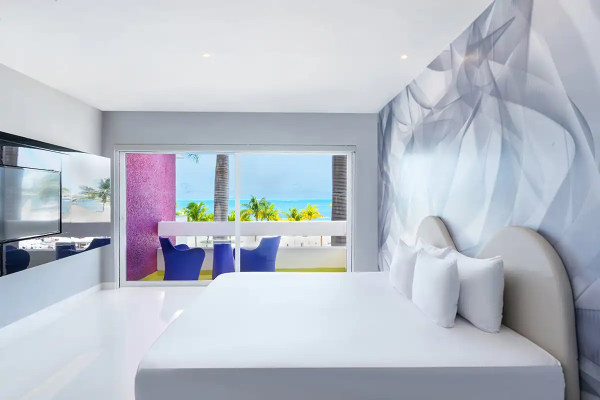 These rooms overlooking the Sexy Pool have a spacious balcony, living area with LED TV, Nespresso coffeemaker, and a bathroom with separate toilet, two sinks, and a spectacular rain shower. Pool and beach concierge service available for this category.