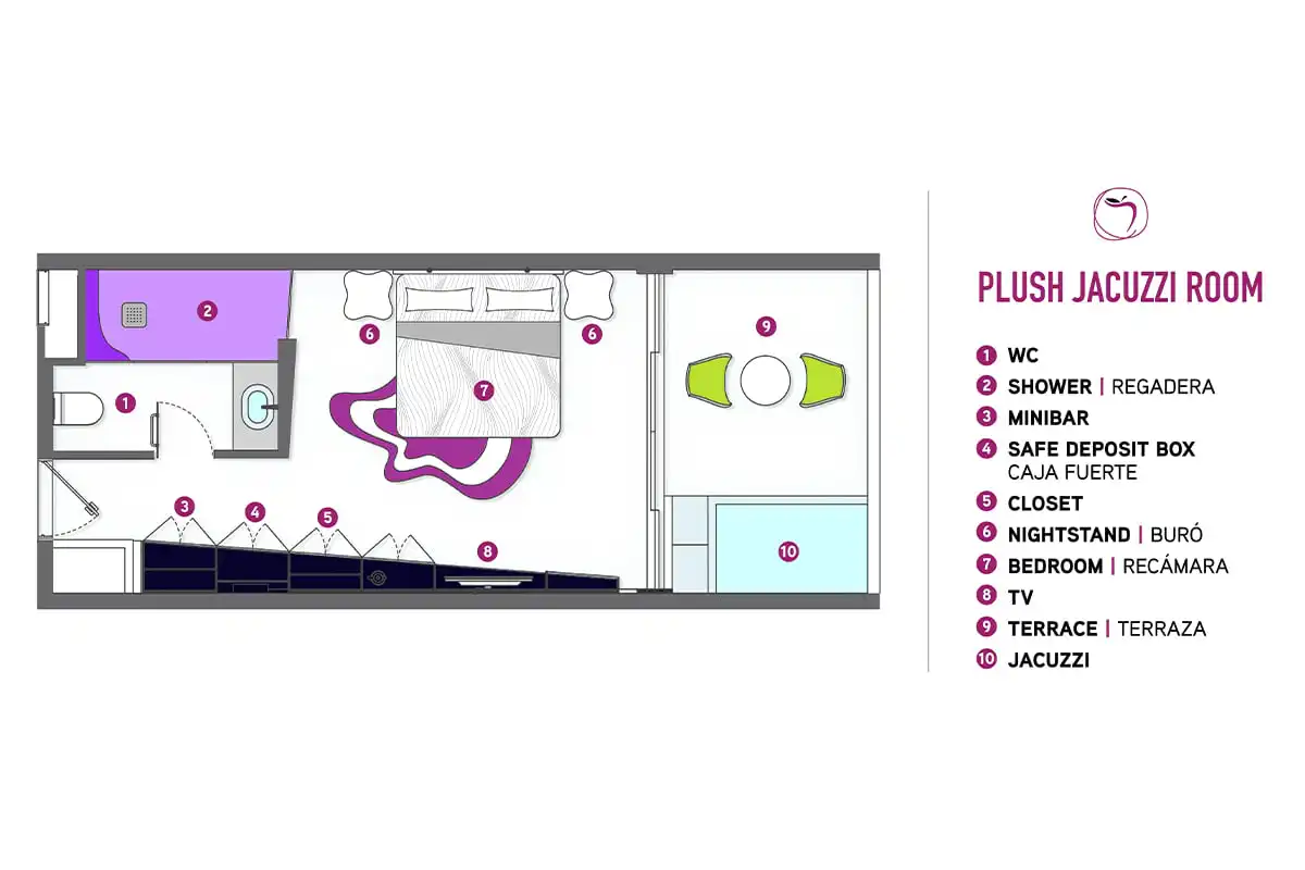 These suites are for travelers seeking additional amenities. Each features an in-room jacuzzi for two, a living area with LED TV, Nespresso coffeemaker, a welcome kit, and a full bathroom with separate toilet, two sinks, a rain shower, and.
