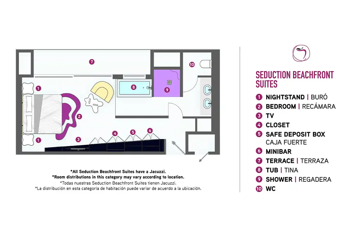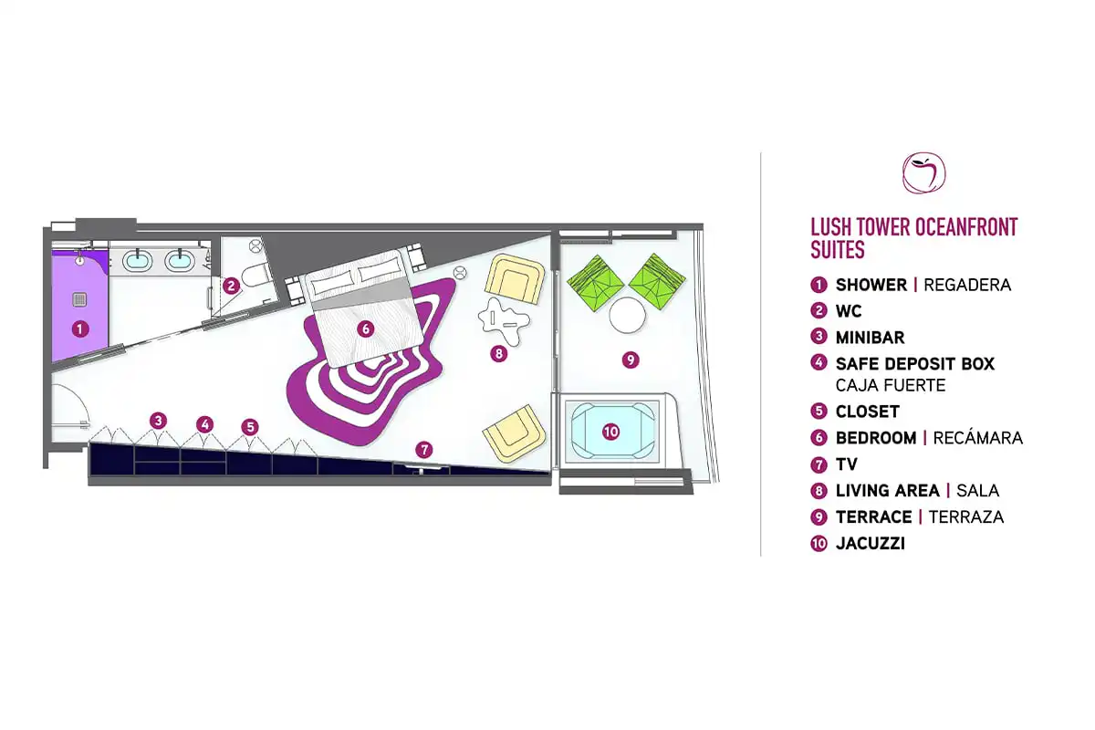 Features a living area with LED TV, Nespresso coffeemaker, oversized balcony with a jacuzzi for two, outdoor sitting area, pool and beach concierge service, and full bathroom with separate toilet, two sinks, and rain shower. Includes a welcome bottle of sparkling wine. Center section of The Tower, on upper levels.