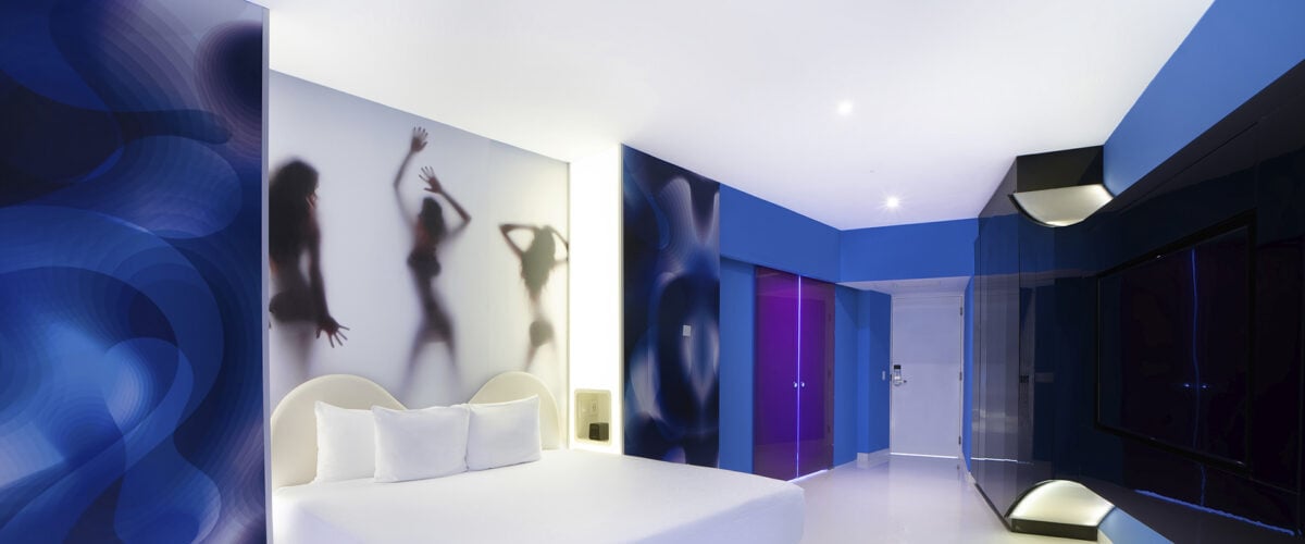 One-bedroom penthouses with 65″ LED TVs, living room, Nespresso coffemake, stocked bar, ice machine, stripper pole, balcony with jacuzzi, sitting area, loungers, butler service, pool and beach concierge, and two bathrooms with one with tub and the other with a rain shower.